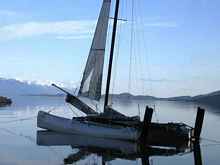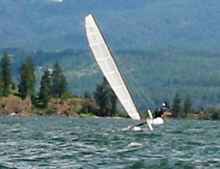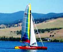 All winter I'd been scanning the classifieds to help a Montana buddy find a catamaran to add to his fleet. He cruises a Beneteau 32 on Flathead Lake, and has been crewing aboard Flight Risk for enough years to get the cat bug. He'd seen a Nacra F18 sitting on a marina lot at the north end of the lake, and thought something like that that might be fun. In April I spotted Hobiegary's beachcat ad for his Stealth F16. It seemed a great deal on a great boat, but I couldn't get a hold of Les. I decided to just buy it for him, so as to not let the deal pass. But as the thoughts bounced around inside my skull, it became difficult to think about parting with a boat that fit my sailing profile so well! By the time I got in touch with him, I was looking for arguments why this might not be the right boat for him. In the end, he bought the Nacra, and I added a fourth boat to my stable.