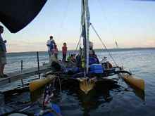 The WindRider provides a wide and stable platform when sailing downwind. On my boat the amas are 12 feet apart. With its relatively deep and long keel well-aft in the boat the steering is sure and stable, even when surfing down the waves. I started out using the full main and the reacher set on the bowsprit. Soon I furled the big head sail, and deployed the jib. Finally I was down to full main alone. As the wind built, the waves, with almost 100 miles of fetch, built as well. I would sail up on a wave, with the crests at times more than 3 feet above the bow, and, as the bow lifted on the wave, push through. A few times the water broke around the windshield. The boat surfed down the face of the wave, once hitting 12.5 knots. I wasn’t exactly white knuckling it – I was exhilarated – but I found myself wishing I had a reef in the main, so that I would feel more confident about sailing closer to the wind if needed, or slowing down to wait for the other guys to catch up. With a full main I felt like all I could do was keep on keeping on and hope that nothing required me to go forward (like a snagged line) or to change course.