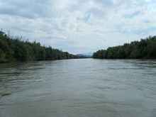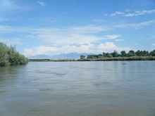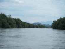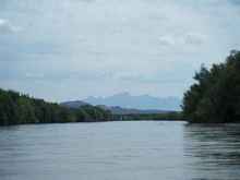 A shot of the river with the mountains far off in the distance.