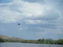 Normally the flow of water on the river gets cut way back at Elephant Butte reservoir around this time of year, but it was still very full on this weekend. Once the flow is cut back it’s impossible to do any paddling. The river in our part of the state is a very muddy brown, not very pretty to look at. The banks on both sides are generally covered with a lot of vegetation. Unfortunately a lot of it is salt cedar, a non-native vegetation, that is very aggressive, hard to get rid of, and extremely thirsty in its water consumption. We did see some screw bean mesquite, cat tails, and wild iris as well. There were a few areas where we encountered a lot of insects. Fortunately we brought insect repellant and sunscreen along. The skies were a little overcast for the first part of our journey, but after a while the sun came out and at times the heat was almost unbearable. This is when I was wishing I had already followed David Routh’s advice and made a bimini top for our puddle duck. There is a road that parallels the river close by, so we were frequently reminded that civilization was not far away. Overall though the traffic noise wasn’t bad and wasn’t noticeable at all in a lot of places. There are a lot of sand bars in the Rio Grande and we forced our way over several of them, but we had to get out of the boat four different times and drag the boat to get across some areas. The water was only about an inch and a half deep in these places. The worst of these was about fifteen yards across and it seemed to take us forever to get over it before we could get back in the boat.