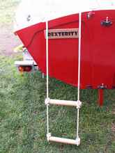 Then there are smaller detail ideas that I have snuck in there, like the extended outer stem with its abstract wave form extension at the top. The tiller extension attachment is with a length of spectra and a vee jam cleat, instead of a stainless steel universal joint. The bungy cord around the tiller holds it steady in light winds or when under power, so I can pour a coffee out of the Thermos. A rope ladder over the transom will help me get back on board should I go for an unintentional swim. A Rule 500gph electric bilge pump in a sump in the cockpit floor and a 26 amp hour AGM battery under the sternsheets, will get rid of a considerable amount of water should do the unthinkable and capsize her.