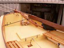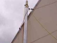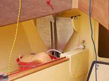 Bungy cord tiller lashing, tiller extension detail, rope from sternsheets to the aft end of the centreboard case is for hooking my feet under when hiking out off the side deck in good breeze.