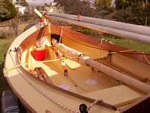 Everything was epoxy coated inside and out before painting or varnishing. The paint used was International Brightside one pack polyurethane, Fire Red hull and Flag Blue sheer stripe, with Cream interior. Red is my favourite colour and I looked extensively among the marine paints for the right shade of red. Then the blue and cream were picked as the complementary colours. A dark sheer stripe lessens the apparent bulk of her high freeboard. The tapering of the sheer stripe towards the bow and transom is pleasing to the eye. International Yacht Primer and Prekote (undercoat), both one pack, were used under the Brightside. I used marine grade paints as I wanted the best paint for the boat. I could have saved myself around $100 by using enamel or acrylic house paint. But as a proportion of the cost of the whole build, this is an insignificant amount.