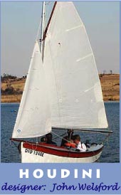 At 4.1 metres (13’ 2”) long and a 1.8m (5’10”) beam the JW Houdini was the biggest that would fit in my garage. John has done some limited coastal cruising in one. She is readily single handed, yet has room for 4 adults and maybe a couple of anklebiters, in reasonable comfort. Her jaunty looks, high freeboard, built-in buoyancy, practical reefing sailing rig and facility for mounting a small outboard ticked the boxes for me.