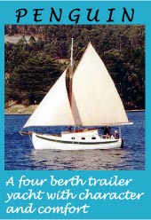 The outboard chosen was a new 2 hp Honda 4 stroke long shaft, mounted on a swing down alloy bracket. This is an air cooled motor and only weighs 13 kg. It has a centrifugal clutch and pivots through 180 degrees for reverse. Normally the motor pivot friction mount is screwed tight so the motor is fixed dead ahead and steering is done with the rudder. The throttle can also be locked, so a half throttle economy cruise speed of 5 knots can be maintained. When sailing the motor and bracket can be swung up, with the prop about half out of the water; then tilted forward to completely clear the prop from the water.