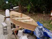 I bent the sides around a temporary frame, 31 inches wide at the top and 28 inches at the bottom. The overall shape seems to work. There is room for a nice sized opening, 25 inches by 40 inches to accommodate my aging buttocks. The ends went together nicely and the boat has a very symmetrical appearance. I chose a cameo paint job out of my left over paint and added to my brides negative thoughts about this latest creation.