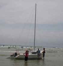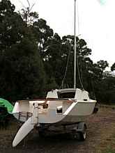 Our first attempt at beach sailing. She draws very little and will float over shallow bars, handling the shore break very well. Our sail was cut very short though by the loss of the bottom rudder pintle which had rattled loose on a long corrugated back road to the beach. This was a result of my mounting the mast rear crutch on the rudder mountings. I'm looking at plan B. Didn't sail much, so took rigging down and had a few trips out into Bass Strait just on motor power. She handles very well in a swell as a motor cruiser.