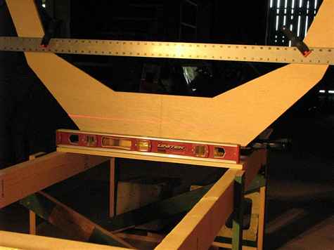 With suggestions from Jacques Mertans, I decided to construct the boat in a basket mold. I first used the mold technique to build Pepita and then again for Just Right. This time, I made use of a laser level to set up the frames. Now that I am nearing the halfway point, errors usually build up. I am amazed that the frames and panels are still level and plumb as close as I can detect with a bubble level and tape. I expect that if I had just cut and taped I might be farther along. I was able to construct the mold in a little more than a weekend. It places the boat at a convenient working level and makes cutting all those extra parts easier.