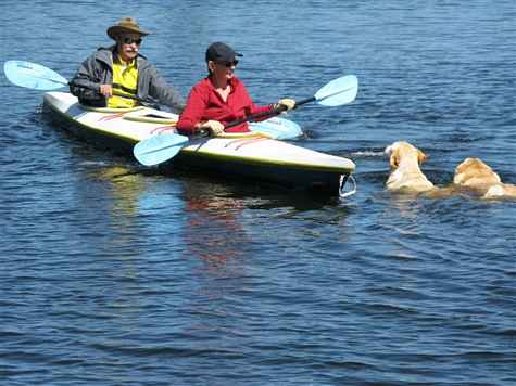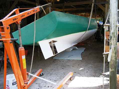I apologize for this flurry of emails lately. A lot of things are going on here at the shop that interest me so I assume you'll be interested also. First is the 20 ft kayak that Sam just finished. This is one slick boat. There's no substitute for hull length, that's what Sam said when I told him how easily this boat slipped through the water. It's also very stable, you can step into it without tipping over. Things slowed down after the bear got in but it still went very well. Abigail is a big yellow Lab who's on a green bean diet to get her slim figure back by Cedar Key. This boat will be at Cedar Key on May 1 along with all of you. Next is Helen Marie hanging up ready for the inside glass job.