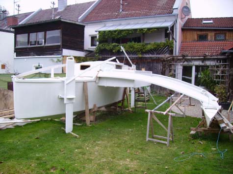 Instead of the timber frames that Lissa shows, you can see that I used plywood. I used the 6 oz diagonal bias tape on the seams and 12 oz diagonal bias fabric on the hull inside. This schedule is very similar to the Vagabond. I am using the System 3 resin and also QuikFair, both nice products. We are building the boat in an unheated barn and the cold temperatures slowed up the building process. I hope to finish before the temperatures get excessively hot.