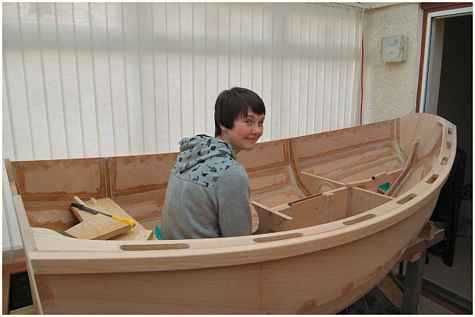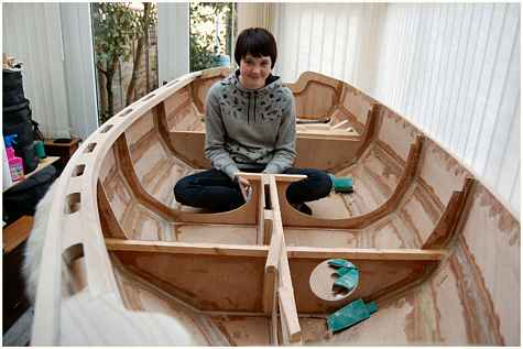 Retired airline Pilot and small boat enthusiast Mike Austen is busy building two stretched to 8ft long Tender Behind sailing dinks , one for himself, and one for Daughter Sherry. His one will eventually become the tender for a bigger boat planned, but in the meantime, to avoid the snow and sleet that covers his backyard near Bristol UK he has brought TB number one into the conservatory at the back of his house, and is contentedly getting on with the build of number one.