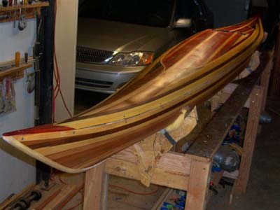 Here is my kayak so far. Had to borrow ALL the tools...etc....read both of Nick's books....looked at tons of YouTube thingies....and ...for the first time...tried woodworking stuff. This is my Kayak wet down after 60 grit sanding. I guess I can go up to 80...then...when warmer weather hits...fiberglass. Totally scared about that, but...then again, I was terrified about starting this project that was so far out of my comfort zone....and it...ended up...so far...being a blast. Got a bunch of exotic woods (didn't even know they existed before)...for the deck.