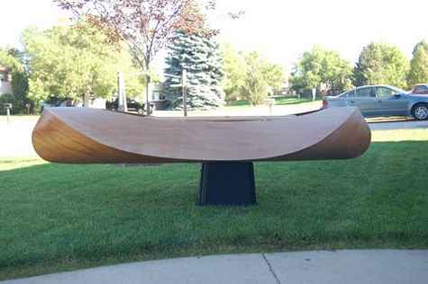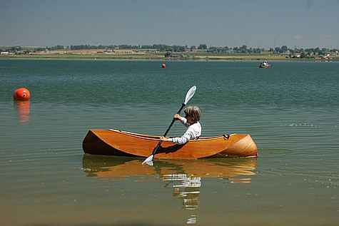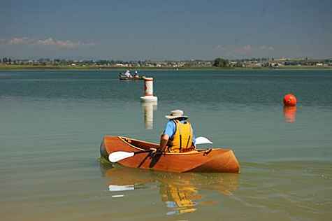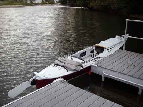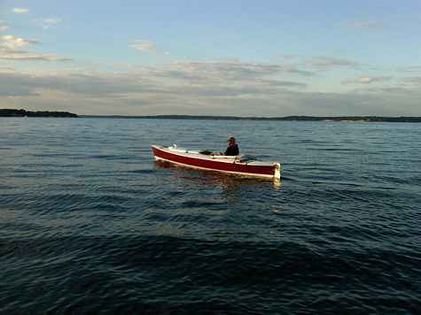 This June I launched my Paul Gartside designed Blue Skies. She's a 20 ft. 3in. long live-aboard pedal boat built to solve the problem of finding waterfront camping when exploring the Chesapeake Bay envrions (much of the bay waterfront is either private or marsh)...... and maybe doing that dream trip down the intercoastal waterway to Florida one fall. Loaded with a week of provisions (3 days water), she comfortably cruises at 3.5 knots. Propulsion is from a Hobie Mirage Drive. Bimini and rudder hardware are from Duckworks. She is constructed of 3/4 in. wide cedar strips under 6 oz. glass/epoxy. The project took two and a half years of (mostly) enjoyable evenings and weekends.
