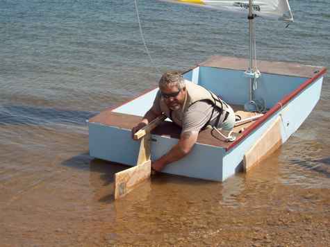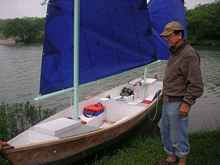 I went for a sail today! It was great to be on the water after this long winter!!!!!! But it was the first time I got #381 in the water. I am a self taught sailer and I am NOT a very good teacher. I learned some stuff today. I will be counting my pennies and putting in an order soon. I learned not to fudge on hardware, it ain’t worth it. I learned if it ain’t right at the dock it sure wont get any better out on the water!! I learned no matter how bad you want or need to sail into the wind it just ain’t going to happen!! My rudder was not mounted up right so it kind of laid over at an angle (not good). I did get some fast runs, enough to make the leeboard hum, then the clamp that held the leeboard in place broke and broke BIG. (I had it rigged so I could move it fore and aft as needed to figure out the trim for the sail.) The only thing to do was drop all sail pull up rudder and paddle 1/2 mile into the wind to get back to the dock. I still had fun though. I want to make the TX200 so bad I can taste it. I hope I ain’t one of the greenhorns that need to be rescued all the time if I do get to come down. P.S. I am building # 405 as we speak!!! Love your site. I am on it 2 or 3 times every day.