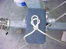 The system works like this: A short line is tied permanently to the bow eye and led to the cockpit area. If your boat has cockpit rails, tie the end of this short line rather tautly to one of the rails. If your boat doesn't have cockpit rails secure the line to a cleat, etc.