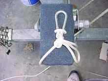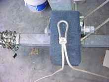 The Carabineer is then clipped onto the already installed permanent bowline, and the Carabineer and anchor rode is allowed to slip forward to the bow eye.