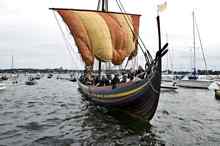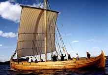 The Sea Stallion replica Viking longship. It is 98 ft in length and 12 ft. beam, crafted from 300 oak trees with 7,000 iron nails and rivets. It has a top speed of 15 to 20 knots