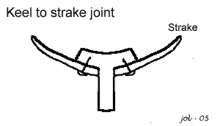 The 76.5 ft. Gokstad ship has a keel made from a single oak log, almost 58 feet long and carved into a T shape. From the keel up to the gunwale are sixteen long oak strakes, each made of several carefully joined boards. The boards were selected from trees with a slight bend so that the grain follows the curve of the hull. Twelve of the strakes are exactly one inch thick, the waterline strake is 1.75 inch, the oar port strake is 1.250, and the two top strakes are .75 inch thick. The gunwale is almost a 4 x 4.