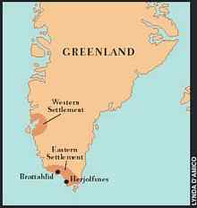 Twenty four boatloads of settlers set out from Iceland in the summer of 986 to colonize Greenland. Only 14 made it, the others having been forced back to port or lost at sea. More followed in the hopes of finding good land and making a better life for themselves. Under the leadership of red-bearded Erik the colonists developed a little bit of Europe just a few hundred miles from North America, a full 500 years before Columbus set foot on the continent. They established dairy and sheep farms throughout the unglaciated areas of the south and eventually built churches, a monastery, a nunnery, and a cathedral boasting an imported bronze bell and greenish tinted glass windows. From the number of farms in both colonies, whose 400 or so stone ruins still dot the landscape, archaeologists guess that the population may have risen to a peak of about 5,000. Trading with Norway, the Greenlanders exchanged live falcons, polar bear skins, narwahl tusks, and walrus ivory and hides for timber, iron, tools, and other essentials, as well luxuries such as raisins, nuts, and wine.