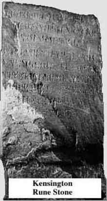 Several examples of Viking writing have been found carved on stones in the United States, most notably the Kensington runestone in Minnesota and the Heavener Stone in Oklahoma. The "Kensington Runestone" is a slab of gray stone, measuring 36 inches long, 16 inches wide, and 6 inches thick. It has runic writing along the face of the stone and along one edge. The stone was found in November of 1898 by a Minnesota farmer named Olaf Ohman while a digging up a poplar tree stump on the southern slope of a 50-foot high knoll. The stone was buried face down about six inches below the surface, with the tree roots wrapped around it. Mr. Ohman and his sons saw the runic letters but did not know what they were. Unfortunately, the stone was not left in place, so they were unable to demonstrate its obvious age from the growth pattern of the tree. The stone was sent to the University of Minnesota and then to Chicago. It was was studied by runic scholars, who interpreted the inscription to be an account of Norse explorers in the 14th Century. It is known King Magnus of Sweden sent a party to Greenland in 1355. They never returned. It is very possible that these men were from that party. The stone bears the date of 1362. The transliteration of the text is generally accepted as: