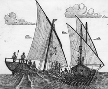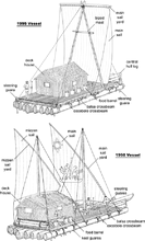 South American sailing rafts are still going strong even now. As late as the 1980s the Jangada, a Brazilian sailing raft, was used for offshore fishing. These rafts were traditionally made of six logs from the Piuva tree (similiar to Balsa) and constructed using wooden pegs, vegetable fibres, and the simplest tools. They are beach launched off the north east coast of Brazil. Their flat bottoms allow crossing offshore reefs at high tide and the solid log construction let waves break over them safely when an open hull boat would swamp. The Jangada is rigged with a single low aspect Bermudian sail on a free standing mast. Both the broad bladed rudder and daggerboard are high aspect ratio. The Jangada in the photo is a medium size craft and would be beached after every trip to allow the logs to dry out. Fishing trips typically would be up to 40 miles at sea and last for two to three days. The deck of the raft is usually awash and the Jangadeiros work with their feet in the water catching hake, yellow tail and mackerel.