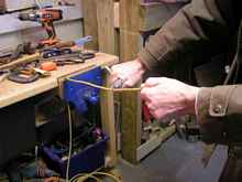 - The easiest way to strip the wire is with a Stanley knife, use a vice to hold the wire with about three feet available for stripping, then run the knife along the wire, always AWAY from yourself, to take a slice of the insulation away. Its a lot harder to explain than do, so here is a picture. Cut the wire into six inch sections, I find this is the best length for ‘plywood to plywood’ stitching, or longer if your joint incorporates any other components.
