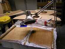- When working in cool weather an infrared bulb will add a bit of extra heat to harden the epoxy. Don’t do as I did and put the heavy bulb in a light weight angle poise, over several hours the weight pulled the lamp down until it go too close and burnt the surface of my dagger board case.