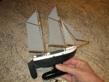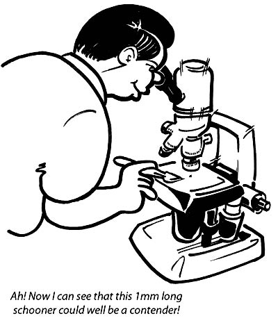 The idea for my challenge actually started while seated one wet New Zealand Winter morning on our `porcelain pony’ (well, many people get their best ideas in the loo!), that of wondering just how small a model schooner could be made to incorporate radio control. I made it as easy as possible in that the entries could be scratchbuilt or kit-adapted and aware of the ingenuity of some keen modelers, I envisaged that an eight or nine inch length on deck model would be about the limit, in other words a 12” Footy would just not be competitive. Was I surprised? Was I ever!