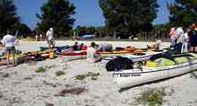 A group of kayaks setup on the beach on Friday, day before the start. Oaracle is in the background, waiting to be moved to the high tide line.