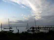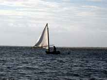 In fact I decided to come down only a few days before. With me was Stuart Bartlett, a swarthy theater technician and rigger with dread locks down to his arse and an accent all the way from his home town of Essex. We were able to store our stuff on Bill's Embers Watch. The first day out I sailed with Dave Chase on his brand new Mikes Boat. NorthernGannet was built by Tim Fox, a professional boat builder, and I have seen him advertising his business in SCA with a picture of his Mikesboat. Very fine craftsmanship. The sails also are very nicely made. Dave was fun to sail with. At the start he was a bit hesitant to go out. I left it up to him but I think he was thankful to have me along as crew that first day since I had a lot of experience sailing a Mikesboat in the kind of weather we were heading out into. Basically it was slightly choppy because of the 15-20 mph winds. It was coming in from the SE by East which means that there was a lot of tacking that had to be done to get around the inlet and start heading south towards the Gun Club. Dave and I went out after the Laguna with Mike and Andrew. They were able to stay close enough to the wind to make it out in only a couple of tacks. The Laguna is a very fast boat. Next came us and then Bill in his Ember’s Watch, with Chuck Lienweber as crew, and Sean in his Piccup Squared. The Princess 22 with Tony Day and Peter Larouche in his boat also came out with us. Then there was “Mac” McDevitt aboard his Windrider Trimaran.