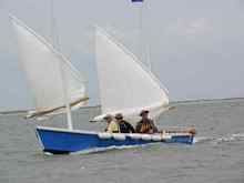 The OBX 130 is a 5 day raid type event, a 130 mile round trip from our launch point to Cape Lookout at the southern end of the sound. The event was hatched by Paul Moffit. His dad Bill and brother Shaun had brought their Joe Michalak designed Mikesboat. Paul is 20-something romantic who had developed a deep love for the Outer Banks. He wanted to share this remote cruising ground with fellow sailors. Chuck Leinweber had come along to crew with Bill. I quickly learned that many of these OBX sailors are a breed apart. They build boats themselves, often a new one for an upcoming event. They report slapping a boat together in a few weekends out of plywood and epoxy. Paint them up so they look pretty good. Andy Linn and Mike Monies were sailing a Laguna, a long barge with two masts and professional looking polytarp sails that Andy sewed up. They were doing the raid circuit from the Everglades Challenge, the Florida 120 and heading for the Texas 200. Three of the boats were Michalak's designs - single leeboards, real shallow draft. Perfectly designed to bump and grind across the shallows in Core Sound.