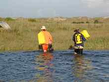 We spent Day 3 hunkered down. As the rain finally cleared we visited the lighthouse and interpretive center, but the winds continued to blow. Some of the guys were out of dry clothes. Their tents had leaked during the night. My motor had fritzed out. I worked in knee deep water to pull off the carb, and Bill, the head of the Moffitt clan made up a wire and cleaned the jet. Tony took good care of me as well. He charged my GPS from his main batteries and gave me fresh gas for my motor. Later he grilled me a hamburger, saving me from another freeze dried dinner. And yup, much to my surprise, the motor fired up.