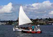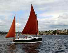 The Phil Bolger-designed TOMBOY, built in 1989, sails just off the CWB floats at the south end of Lake Union.