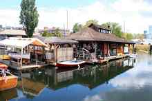 The floating boathouse at The Center For Wooden Boats in Seattle WA.