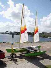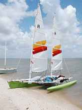 One might try now to compare these options, just to get an idea of what the scale is. For example, if I want a Hobie 16 mainsail but am not concerned with being Hobie 16 class legal, the Sailrite kit is about $400, I can get a used main that needs a bit of patching right now from Bacon for $275, a main and jib went on ebay a week ago for $265, a new sail ordered from Duckworks would be about $700, and a new sail from Mariner Sails in Dallas is $915. For a smaller sail the prices will be lower but the multiples of cost will be about the same, or the used prices will be even better, beachcats are often sailed with old sails for fun so they don't have the same nice effect of buying new sails every few years that pure fleet racing classes do.