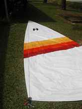 for small fully battened mains. There were a few, but no perfect matches. I thought that if I held out I could eventually get two small fully battened mains from a fast dinghy class that would be about right, but the prices were a bit beyond my pain threshold, something like $150 each. I agonized. Then I found two unfinished dinghy mains about the right size, identical and something like $120 for both of them. I got them and sewed on corners and luff pockets. Ok, that didn't work, they were much too full:
