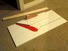 An angled fence block is mounted to the base board adjacent the red zone. The fence block has a 45 degree miter on one end. The angled fence block is securely attached to the base by three pocket screws.