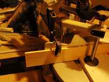 I played with the angle setting to get a scarf of the right length. Recall the angled fence block was mitered at 45 degrees. I have the saw itself set at 37.5 degrees. This makes a 7.5 degree scarf (45 degrees minus 37.5 degrees). I initially used a 10 degree scarf, but that produced scarfs that were too short.