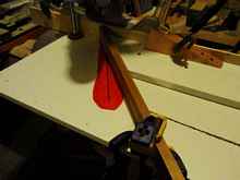 The jig has a 2 foot x 3 foot base. You can see the initial zero clearance saw slots highlighted in red. Ideally, you should have only one saw slot, but it took two tries for me to get a scarf angle I liked. More details on these angles are below. Each saw slot was made by making a cut through the base without any workpiece in play yet. That red zone is an important safety feature and is not merely added for purposes of this article. I need to keep clamps, screws, etc. out of the red zone to avoid conflict with the saw blade and guard. You can see that the base also has another slot that comes in from the right and ends short of the saw blade slot. This other slot is an artifact from an earlier jig using this same base board and serves no purpose in the present jig. Pretend it’s not there.