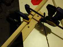 So, now we are about to make a scarf. The stringer stock as shown in Fig. 8 is clamped to the jig in position against the angled fence block. Three clamps are used. One clamps down on the stringer, and the other two are butted against each face of the stringer to help prevent undesired movement of the workpiece. Version 1.2 is a little better for this, as we will see.