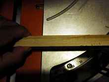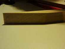 The resultant scarf made with jig version 1.1 is shown in Figs. 9 and 10. To give a sense of scale, this test piece of scrap wood is a 1 x 3. The SC20 stringer stock is generally ¾ x 1 ¼, or about half the width of this test piece. Version 1.2 has a desirable improvement as we will see. The scarfs look the same with version 1.2, but I think the workpiece is held more securely to the jig.