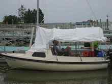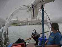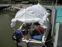 View toward stern. A semicircular piece of tarp was sewn on the back. The rest of it was cut from one piece. The diagonal tie-downs keep the boom from swinging.