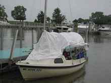 Nylon straps with D-rings, nylon ties, and velcro strips were sewn on with a zigzag stitch, then sealed with 3M 5200 sealant. The light line ties the tarp down to the pad eyes attached to the boat.