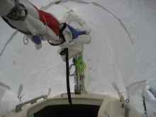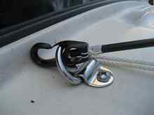 The clips keep the poles from springing out and flying into the water during setup and take down. Fortunately we learned this in the driveway, then installed the clips. The light line attaches to a D-ring on the tarp and holds it down (shown earlier). Smaller pad eyes also would have worked, but I wanted strong tie down points for general use.