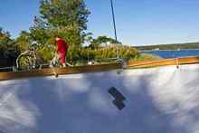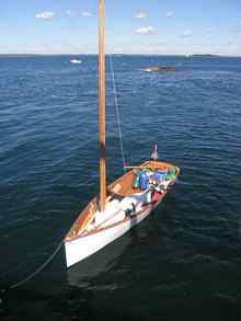 I then found myself freely sailing through the air since the boat came to a sudden and complete stop with a heartstopping crunch. I was pitched into the forward section of the boat head first and the mainsheet got wrapped around my leg. The boat started to go over on its side and Jason and I scrambled for the windward rail. I went grabbing for the mainsheet and dumped the 105 square feet of lug power, and Zinea promptly went over onto the starboard side where Jason was sitting. The gunwale dipped and water starting coming through the inwale. I had a vision of Spanish castaways swimming at night to a deserted island with the wreck of a boat- my boat- left to die on the rocks as we pushed flotsam ahead of us. All I could think was: I hope we can get a fire started. Fortunately, my vision was not to pass, and the boat came back upright as we flung ourselves over the daggerboard trunk. I directed Jason to drop the sail and he dutifully uncleated the halyard. An advantage of the balanced lug is that it strikes in but a moment, and the yard came down with a solid whack on my shoulder from fifteen feet above.
