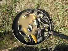 Islands and rocks surged in and out of view, and with Jason at the chart, we navigated our way between them and pulled into a small harbor on the ocean side of Jewell Island, right next to the Punchbowl, the largest tidepool in Maine. Dodging boats, swimming children, dogs, and miscellaneous oars we crunched up on the beach and jumped out. There were several parties enjoying a beautiful sunny Labor Day, with fires and feasts and festivities. Jason and I skulked around looking for a campsite, and since it was Monday night we found a recently vacated one. A local fisherman (by occupation) out with his family put together a most stupendous meal of fresh mussels just harvested from the Punchbowl and cooked in their own juices over an open fire. It was a divine moment—sitting in the sun, on a sandy beach, looking East over the Atlantic, and eating mussels culled and cooked within 5 yards of where they had lived, given to us in a spirit of sharing. This is what it’s all about!