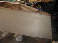 When warmer temps allowed, it was out to the garage to layout and cut side panels, butt them together, and begin going 3-D. The construction was really pretty simple, you just have to think a few steps ahead, and correct the inevitable mistakes as you go. Attention to detail, and the overall alignment of the boat before you lock it together with the bottom is crucial. A crooked or twisted boat isn’t a good thing. The bottom was applied, nailed down, and trimmed back with a pattern bit in the router. The bottom had a layer of glass cloth and graphite impregnated epoxy applied. Time to flip her over!