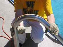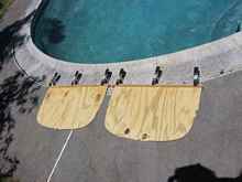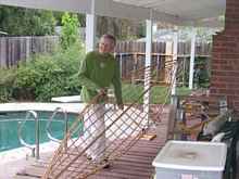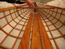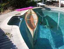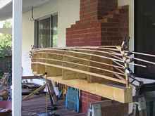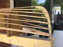 I used red oak for the ribs because I had read that it was a good bending wood and some of the bends on this boat are close to 180 degrees. I soaked the pieces overnight in the pool and then steamed them for about a half hour before bending them. You have to work fast and I still cracked a few pieces on the tighter bends.