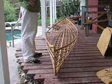 I had been looking at the Geodesic Airolight boats and I finally decided to build one. I liked the idea of a boat that was light enough to carry to the water. I decided on the Arrow 14. I wasn't sure if I had the time or skills to tackle this project but it looked like fun and I loved the looks of the boat, so I sent away for the plans. That was about three years ago. Two weeks ago I took it out on its maiden voyage. During that time I worked on it once in awhile for an hour or two on a Saturday. I would roughly estimate that it took about 60 hours to make it When the cold wet weather came, I put it in the garage or even in the house and waited until spring to continue.