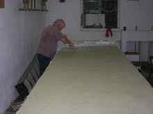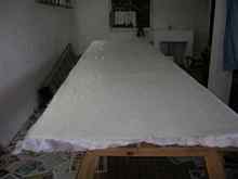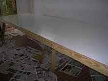 First layer is the matt, the second layer is the bi-axial. Gets kinda messy and you have to work quickly. Both go down while everything is wetted out, together. I rolled the cloth up, two rolls. I wetted out the table top with resin, rolled first layer of matt, worked out the bubbles and added more resin. Then I added the second layer of the biaxial. Generally I worked about two feet at a time, smoothing out the cloth and getting rid of the bubbles. After the initial two feet, to get the rolls out of the way, I laid the rolls back on the area I had just finished. I wetted out the next section on the table top, and unrolled the matt cloth into that area, then the biaxial. I repaired any damage done when I laid the cloth on top of the finished section. Continue to the end.